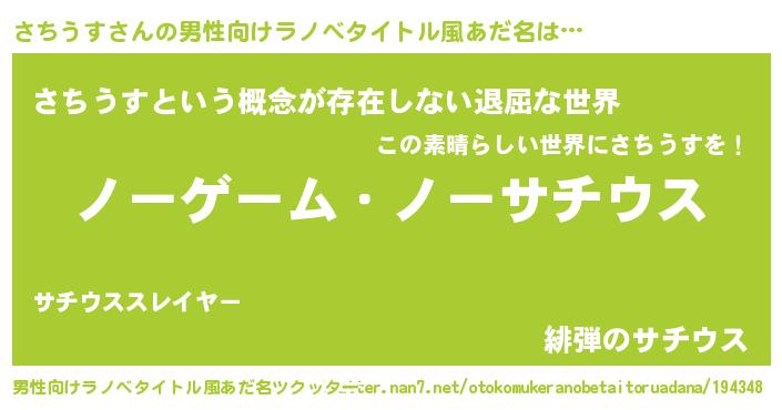 | 女子向けラノベタイトル風あだ名 | 『死神さちうすの再婚』 |