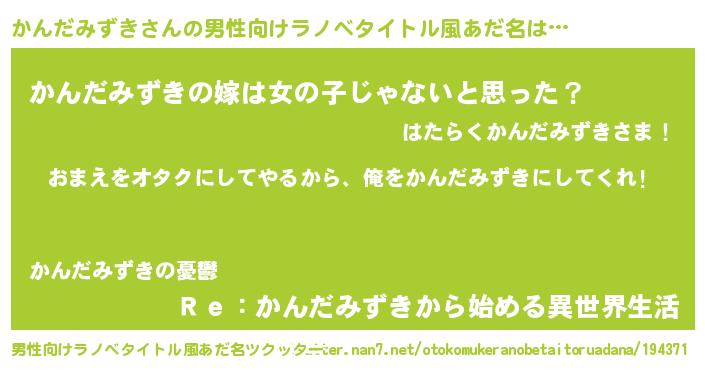 | 女子向けラノベタイトル風あだ名 | 『かんだみずき夫妻のなれそめ』 |