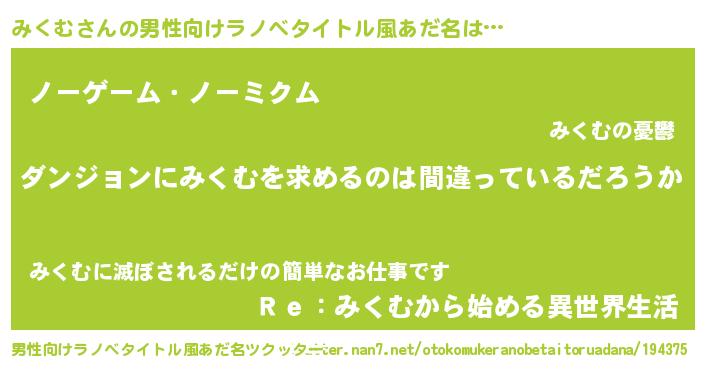 | 胡散臭い通販商品みたいなあだ名 | 『信頼と実績のサプリメント…その名も「みくむ」』 |