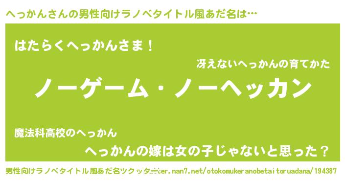 | 女子向けラノベタイトル風あだ名 | 『死神へっかんの再婚』 |