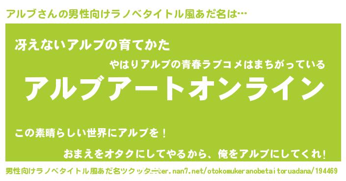 | 女子向けラノベタイトル風あだ名 | 『誰かこのアルブを説明してください! ~契約から始まるウェディング~』 |