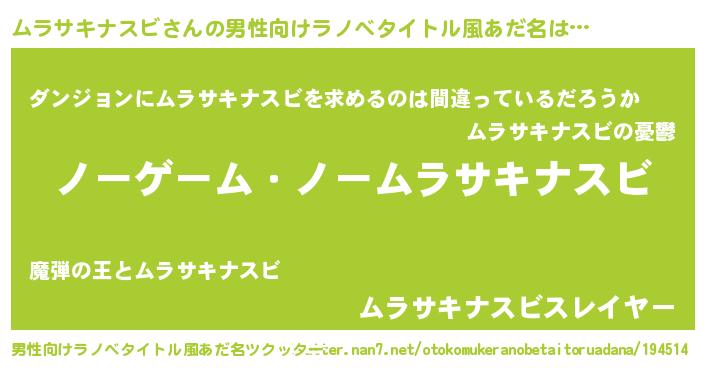 | 女子向けラノベタイトル風あだ名 | 『死神ムラサキナスビの再婚』 |