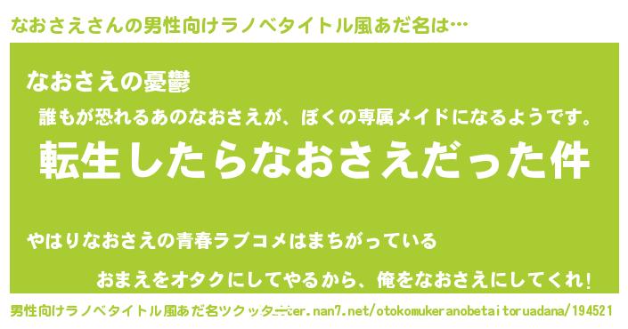 | 胡散臭い通販商品みたいなあだ名 | 『モテモテ間違いなし霊験あらたかなお札…その名も「なおさえ」』 |