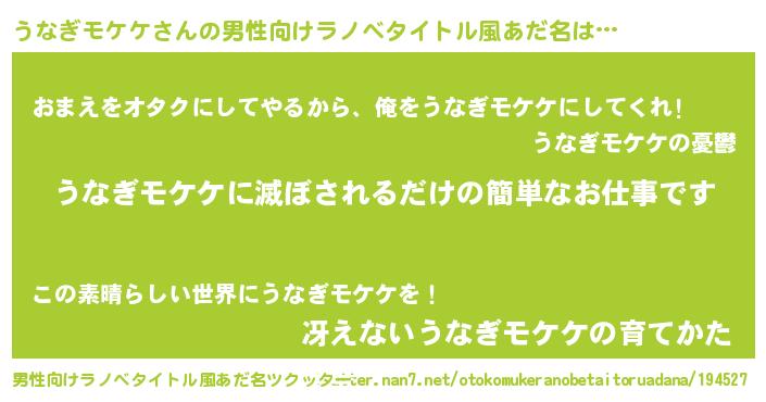| 女子向けラノベタイトル風あだ名 | 『横柄うなぎモケケと宰相陛下』 |