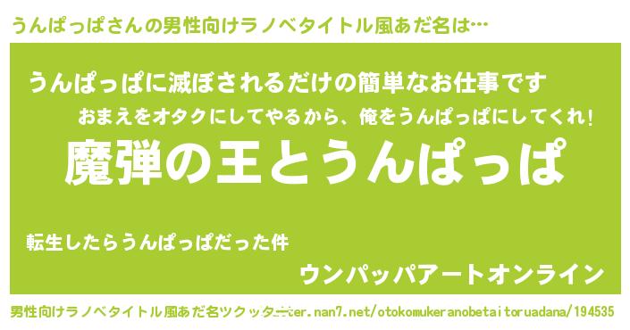 | 女子向けラノベタイトル風あだ名 | 『乙女ゲームの破滅フラグしかない悪役うんぱっぱに転生してしまった…』 |
