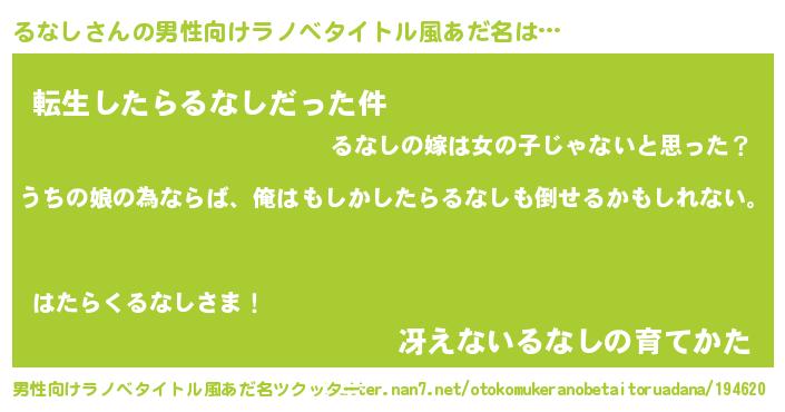 | 女子向けラノベタイトル風あだ名 | 『るなしの婚約者』『るなし様がみてる』 |