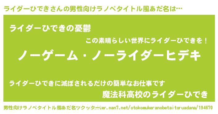 | 女子向けラノベタイトル風あだ名 | 『死神ライダーひできの再婚』 |