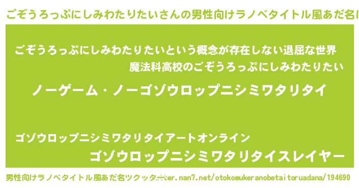 | 伝説のあだ名 | 『救世主となる錬金術士ごぞうろっぷにしみわたりたい』 |