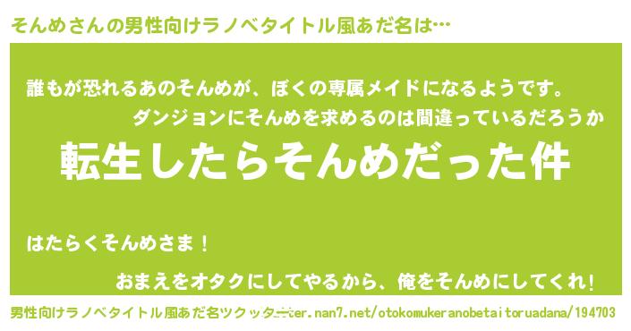 | ヒーロー風カッコイイあだ名 | 『ネオソンメ』『慈愛の使者そんめ』 |