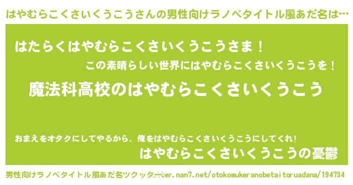 | 女子向けラノベタイトル風あだ名 | 『はやむらこくさいくうこうなんてお断りですっ。』 |