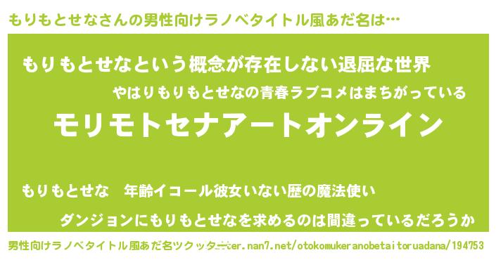 | 女子向けラノベタイトル風あだ名 | 『もりもとせな姫と円卓の騎士』 |