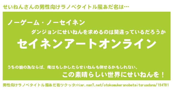 | 女子向けラノベタイトル風あだ名 | 『せいねん姫と円卓の騎士』 |