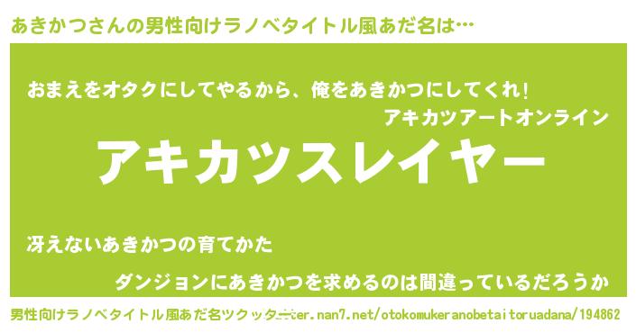 | 女子向けラノベタイトル風あだ名 | 『婚約破棄系悪役あきかつに転生したので、保身に走りました。』 |