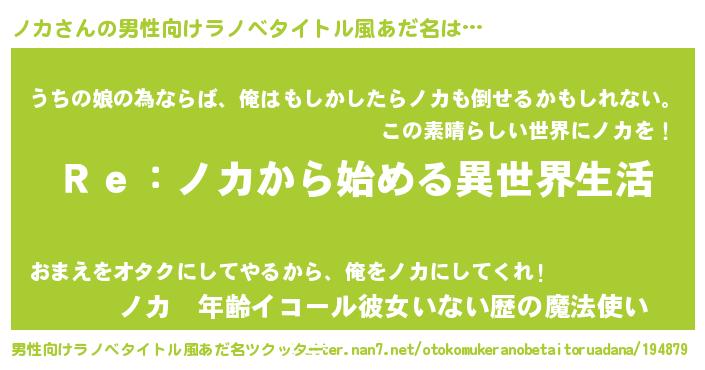 | 女子向けラノベタイトル風あだ名 | 『闇のノカ』『ノカ伯爵の花嫁』 |