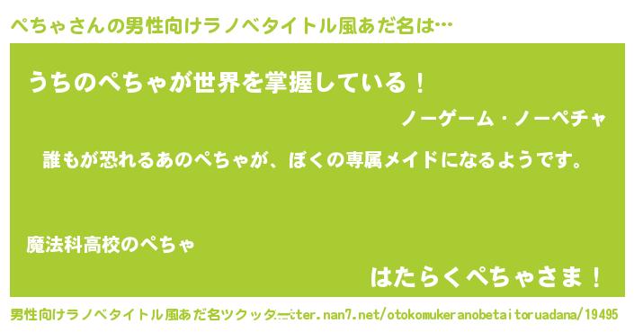 | 女子向けラノベタイトル風あだ名 | 『ぺちゃの契約王妃』『死神ぺちゃの再婚』 |