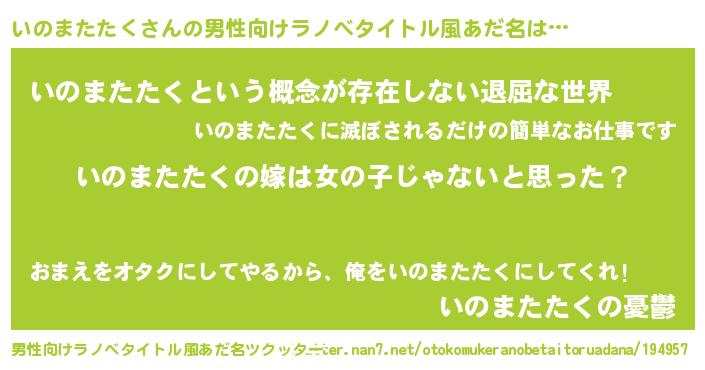 | 女子向けラノベタイトル風あだ名 | 『いのまたたくの卵を拾いまして』 |