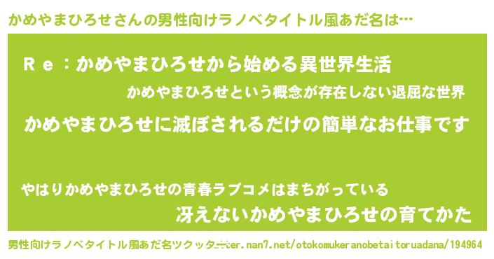 | 胡散臭い通販商品みたいなあだ名 | 『テレビで話題のアガリクス…その名も「かめやまひろせ」』 |