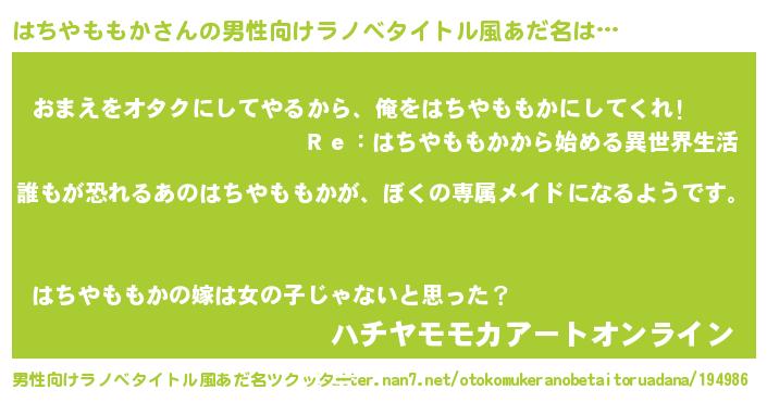 | 胡散臭い通販商品みたいなあだ名 | 『来世でも幸せになれる健康食品…その名も「はちやももか」』 |