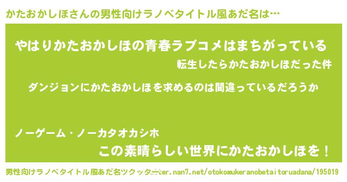| 女子向けラノベタイトル風あだ名 | 『かたおかしほの卵を拾いまして』 |