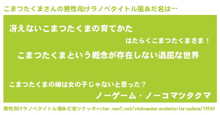 | 女子向けラノベタイトル風あだ名 | 『異世界で失敗しない100のこまつたくま』 |