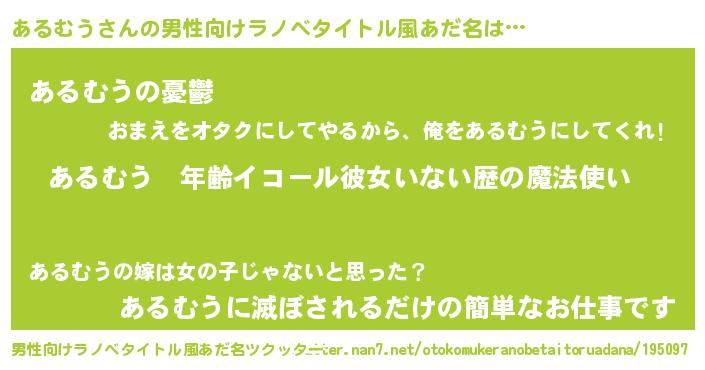 | 女子向けラノベタイトル風あだ名 | 『あるむうの玉の輿計画!』 |