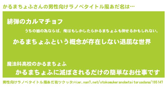 | 女子向けラノベタイトル風あだ名 | 『異世界で失敗しない100のかるまちょふ』 |