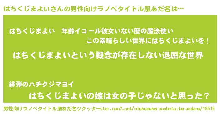 | 女子向けラノベタイトル風あだ名 | 『異世界で失敗しない100のはちくじまよい』 |