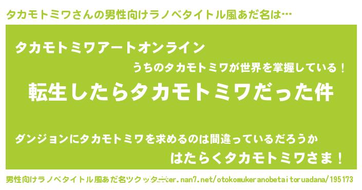 | 女子向けラノベタイトル風あだ名 | 『タカモトミワの玉の輿計画!』 |