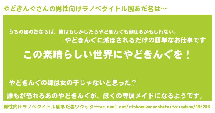| 胡散臭い通販商品みたいなあだ名 | 『あなたにだけ特別に提供する限定10本のレアな日本酒…その名も「やどきんぐ」』 |