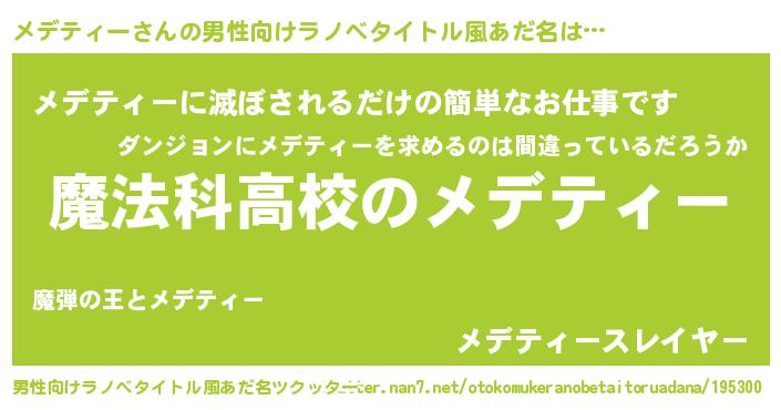 | 女子向けラノベタイトル風あだ名 | 『メデティーなんてお断りですっ。』 |
