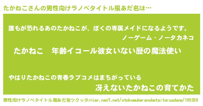 | 女子向けラノベタイトル風あだ名 | 『たかねこの玉の輿計画!』 |