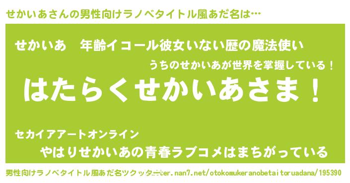 | ヒーロー風カッコイイあだ名 | 『ウルトラせかいあマン』『ネオセカイア』 |