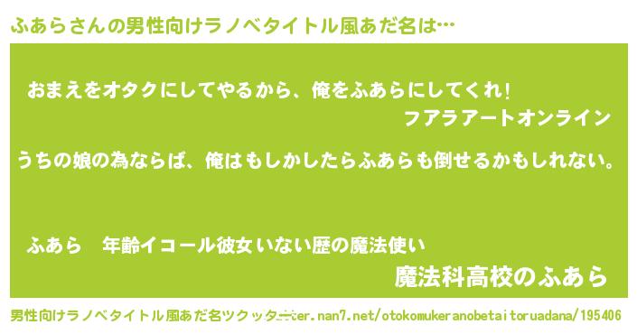 | 女子向けラノベタイトル風あだ名 | 『ふあら伯爵の花嫁』 |