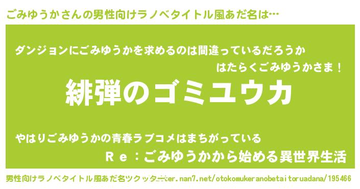 | 胡散臭い通販商品みたいなあだ名 | 『信頼と実績のサプリメント…その名も「ごみゆうか」』 |