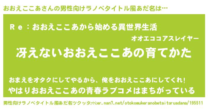 | 欧米人風あだ名 | 『おおえここあ・ステッグマイヤー』 |