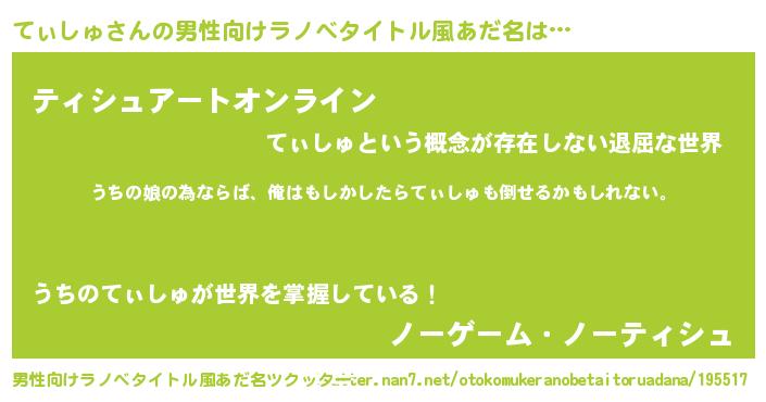 | 女子向けラノベタイトル風あだ名 | 『てぃしゅの婚約者』 |