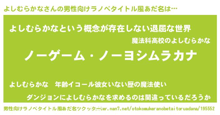 | 女子向けラノベタイトル風あだ名 | 『死神よしむらかなの再婚』 |