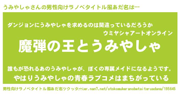 | 女子向けラノベタイトル風あだ名 | 『うみやしゃが死なない童話 林檎のうみやしゃの診療簿』 |