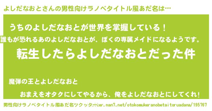 | 女子向けラノベタイトル風あだ名 | 『婚約破棄系悪役よしだなおとに転生したので、保身に走りました。』 |