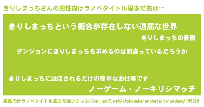 | 女子向けラノベタイトル風あだ名 | 『きりしまっちの卵を拾いまして』 |