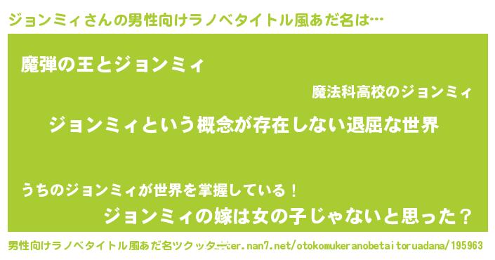 | 女子向けラノベタイトル風あだ名 | 『異世界で失敗しない100のジョンミィ』 |