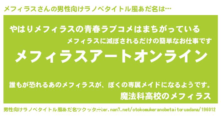 | 女子向けラノベタイトル風あだ名 | 『誰かこのメフィラスを説明してください! ~契約から始まるウェディング~』 |