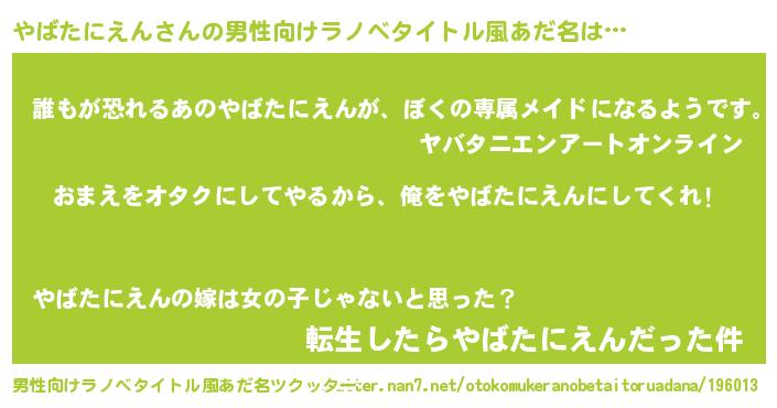 | 女子向けラノベタイトル風あだ名 | 『やばたにえん夫妻のなれそめ』 |