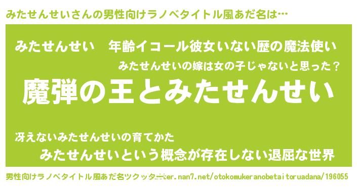 | 女子向けラノベタイトル風あだ名 | 『みたせんせいが死なない童話 林檎のみたせんせいの診療簿』 |