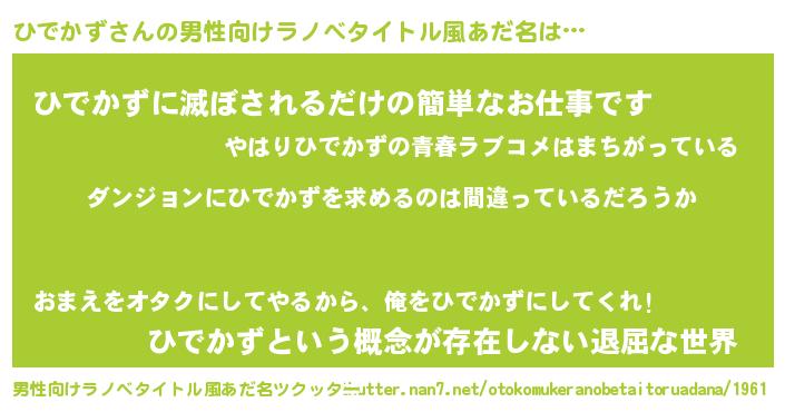 | 胡散臭い通販商品みたいなあだ名 | 『信頼と実績のサプリメント…その名も「ひでかず」』 |