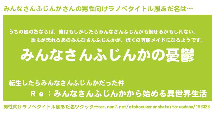 | 女子向けラノベタイトル風あだ名 | 『みんなさんふじんか姫と円卓の騎士』 |