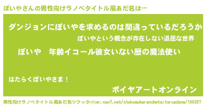 | 女子向けラノベタイトル風あだ名 | 『ぽいやの玉の輿計画!』 |