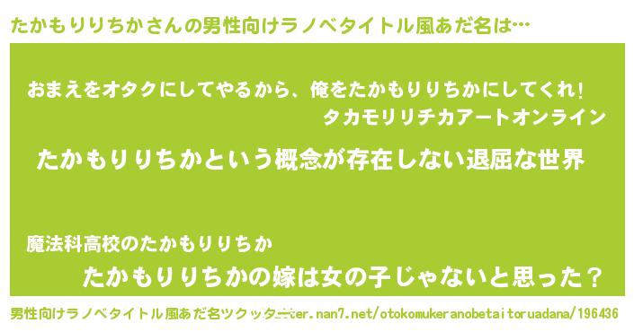 | 女子向けラノベタイトル風あだ名 | 『異世界で失敗しない100のたかもりりちか』 |