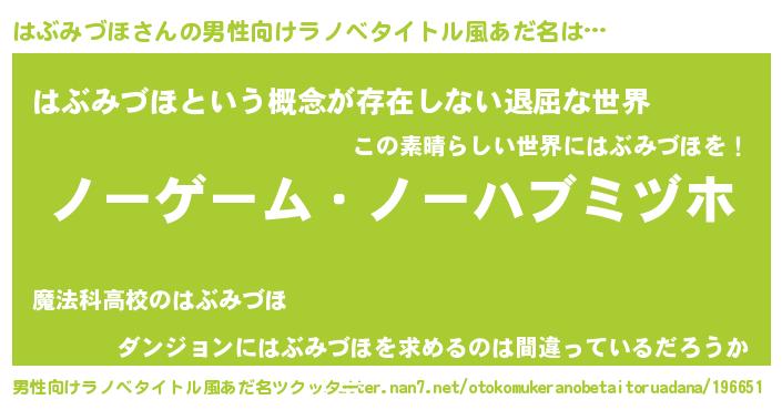 | 伝説のあだ名 | 『救世主となる錬金術士はぶみづほ』 |