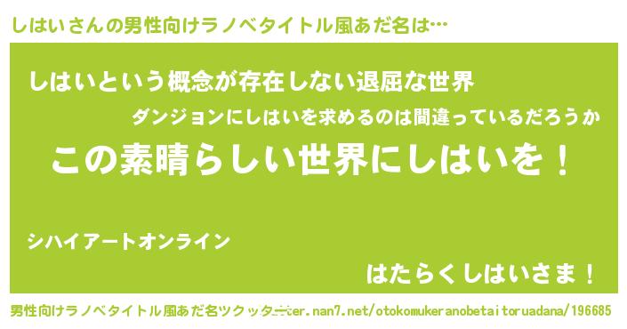 | 胡散臭い通販商品みたいなあだ名 | 『あなたにだけ特別に提供する100年もののヴィンテージワイン…その名も「しはい」』 |